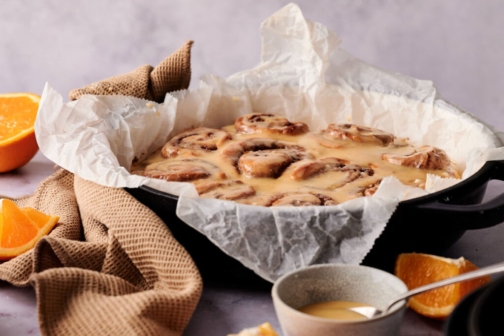 A baking dish lined with parchment paper holds iced Air Fryer Orange Rolls, surrounded by a brown towel, orange slices, and a small bowl on a light surface.