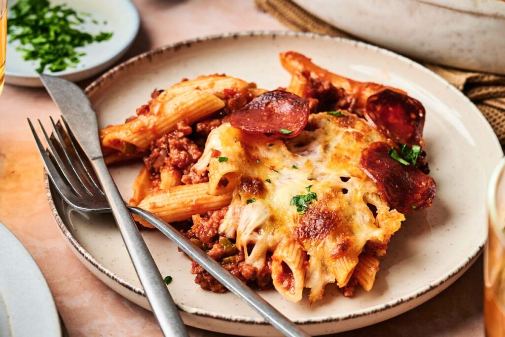 - Transfer the mixture to the prepared casserole dish. Sprinkle with shredded mozzarella and top with pepperoni slices.2 ½ cups mozzarella, 25 slices pepperoni