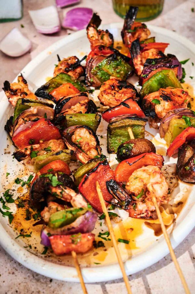 Grilled shrimp kabobs with bell peppers, onions, and mushrooms are served on a white plate, garnished with fresh herbs and sauce.