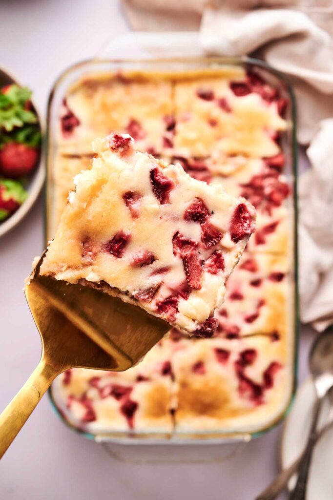 I made this strawberry earthquake cake on a weekend afternoon, and my kitchen smelled amazing for hours. I couldn’t wait to slice into it—the gooey cheesecake filling smothering my warm strawberry cake was too tempting. My favorite part might be the melted white chocolate chips hiding in every bite. If you’re anything like me, you’ll want to go back for seconds (or thirds).