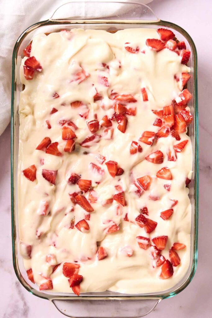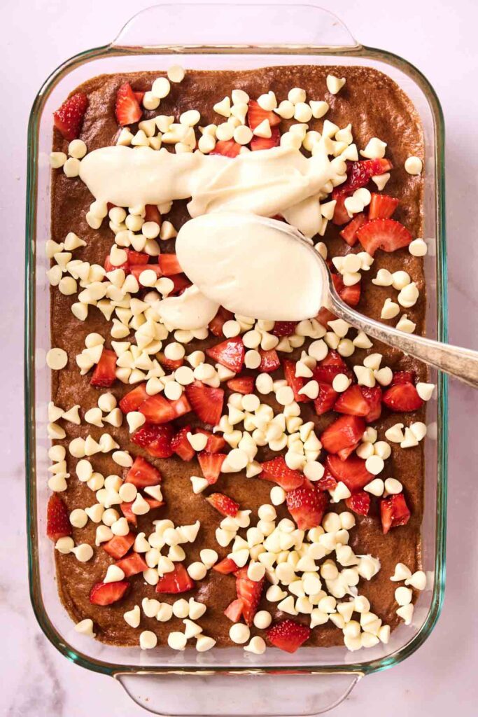 • Once the cake is done, remove from the oven. Scatter the diced strawberries and white chocolate chips over the top. Drop spoonfuls of the cream cheese mixture evenly over the surface.